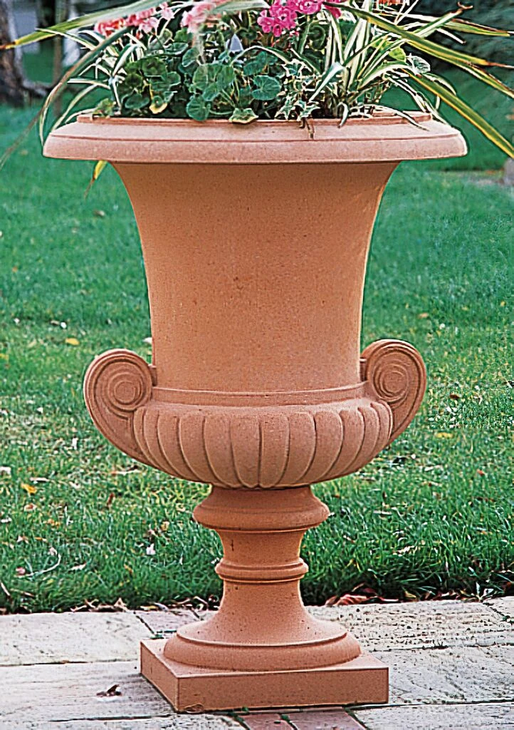 Diese klassisch gestaltete Gartenamphore im zeitlosen Design ist ideal für Garten, Terrasse und Grundstück. Auf einem quadratischen Sockel stehend zeichnet sich die Blumenvase durch eine kunstvolle Verarbeitung aus. Elegante Details wie schneckenhausförmig geformte Schmuckelemente und ein prunkvoll gestalteter Rand machen dieses Pflanzgefäß zu etwas ganz Besonderem. Egal, ob auf freier Fläche stehend, oder auf der Veranda thronend, diese Gartenamphore verleiht ihrer Umgebung Glanz und Harmonie. Aufgrund der besonderen Ausstrahlung ist die Steinamphore ein besonderes Accessoire für Wintergärten oder Eingangsbereiche.