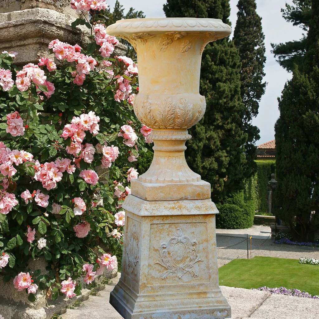 Wir begrüßen Sie bei GARTENTRAUM und freuen uns, dass Sie sich für diese historische Gartenamphore aus Stein interessieren. Diese Pflanzamphore mit reizvollem Charme wurde nach historischen Vorlagen vergangener Kunstepochen für die Dekoration von Gärten, Terrassen, Orangerien und Parkanlagen gestaltet. Unsere stilvolle Steinvase Grandessa kann liebevoll bepflanzt sowohl im Zentrum Ihres Gartens auf einer gepflegten Rasenfläche geschmackvoll platziert werden, hat aber auch inmitten eines romantischen Blumenbeetes, am Rande der Terrasse oder am Ende einer Sichtachse im Garten einen hohen Dekorationswert. Zu den Seiten einer historischen Toreinfahrt setzen diese Pflanzgefäße aus hochwertigem Sandsteinguss dekorative wie repräsentative Akzente. Bereichern Sie Ihre Hauseingang, Ihren Vorgarten oder einen Gartenbereich mit dieser wertvollen Steinamphore und setzen Sie Gartenhighlights mit reizvollen Blumenarrangements. Sie können diese schöne Gartenvase, die wir in verschiedenen Ausführungen anbieten, auch mit einem passenden Steinpodest als Gartenensemble online bestellen und kaufen.