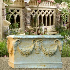 Dieser einzigartige nach einem venezianischen Vorbild der Renaissance nachgestellte Steintrog ist eine vielseitig einsetzbare Bereicherung für jeden Garten. Widderköpfe, Wappen und Blumengebinde bilden eine edle Verzierung und geben diesem Steingefäß einen kostbaren Ausdruck. Die Widderköpfe erscheinen markant und ausdrucksstark, womit dieses Gefäß Ansehen und Energie ausstrahlt. Als Steinvase mit bunten Frühblühern wird der Trog den Frühling einläuten, als Kräutergarten jeden Koch begeistern. In Kombination mit einem Brunnen kommt jeder Liebhaber der Renaissancekunst auf seine Kosten.