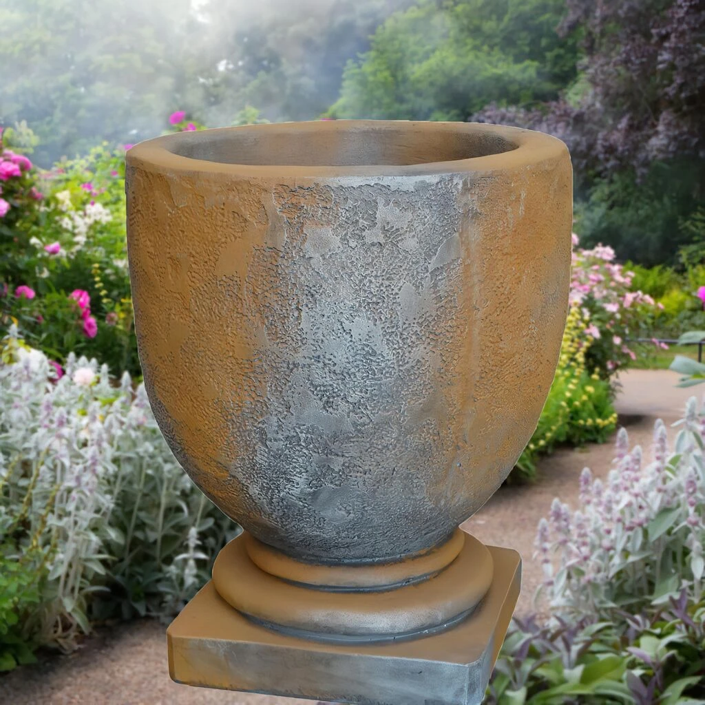 Die Pflanzgefäße werden aus hochwertigem Stein im Steingussverfahren gefertigt. Beim traditionellen Gussverfahren werden natürlicher Stein in Form von Sand, Zuschlagstoffe, Portlandzement und Wasser vermischt. Die Mischung wird mittels aufwendiger Techniken in eine Hohlform gegossen, um Luftlöcher zu verhindern. Dies garantiert eine hohe Frostfestigkeit. Nach dem Austrocknen der gehärteten Kunststeinmasse wird das Pflanzgefäß vorsichtig aus der Hohlform gelöst und zum Aushärten an der frischen Luft wettergeschützt gelagert. Danach erfolgt die weitere Verarbeitung in liebevoller Handarbeit. Hierbei kommt zu kleinen individuellen Details, welche die Amphore einzigartig werden lassen. Nach der Fertigung erhält diese ihre Färbung.