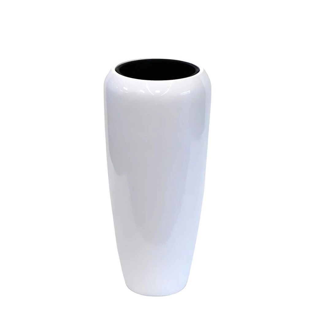 Moderne Pflanzvase in glänzendem Weiß für draußen und drinnen. Das Pflanzgefäß wird aus Polystone gefertigt und ist witterungsbeständig und langlebig. Die Vase verfügt über einen praktischen Kunststoffeinsatz, ein Wasserstandsanzeiger ist optional erhältlich.