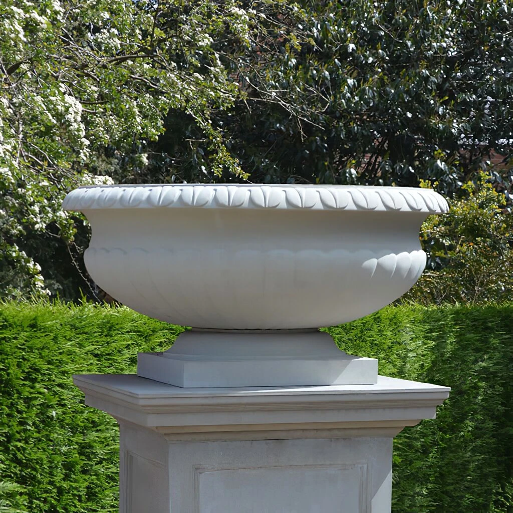 Dieses sehr große Pflanzgefäß aus Steinguss ist frostsicher und witterungsbeständig. Hergestellt wird die große Pflanzschale in einer traditionsreichen Künstlerwerkstatt in England. Ob mit oder ohne Steinsockel, dieses wundervolle Pflanzgefäß ist ein attraktiver Hingucker in klassischen sowie modernen Gärten. Auf Grund der Größe und des hohen Gewichts, sollte die Pflanzschale mechanisch auf Ihren Platz gehoben werden. Der Durchmesser der Standfläche ist 61,6cm.