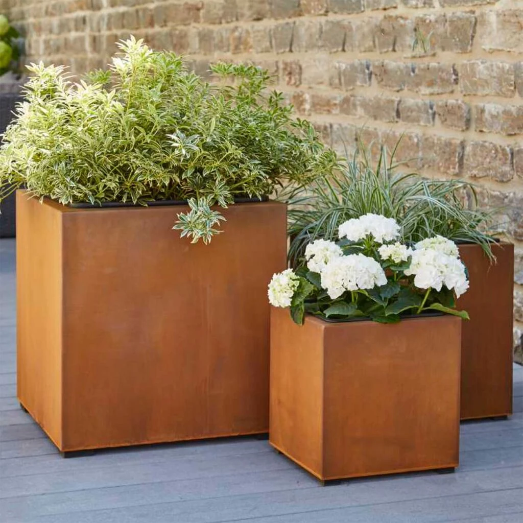 Unsere Pflanzgefäße in Rost Optik werden aus gewalzten Metallplatten gefertigt. Die Einzelteile werden mit Hilfe eines Lasers ausgeschnitten und miteinander verschweißt. Anschließend wird das Metall oberflächlich behandelt, so dass die ansprechende Rost Patina entsteht.