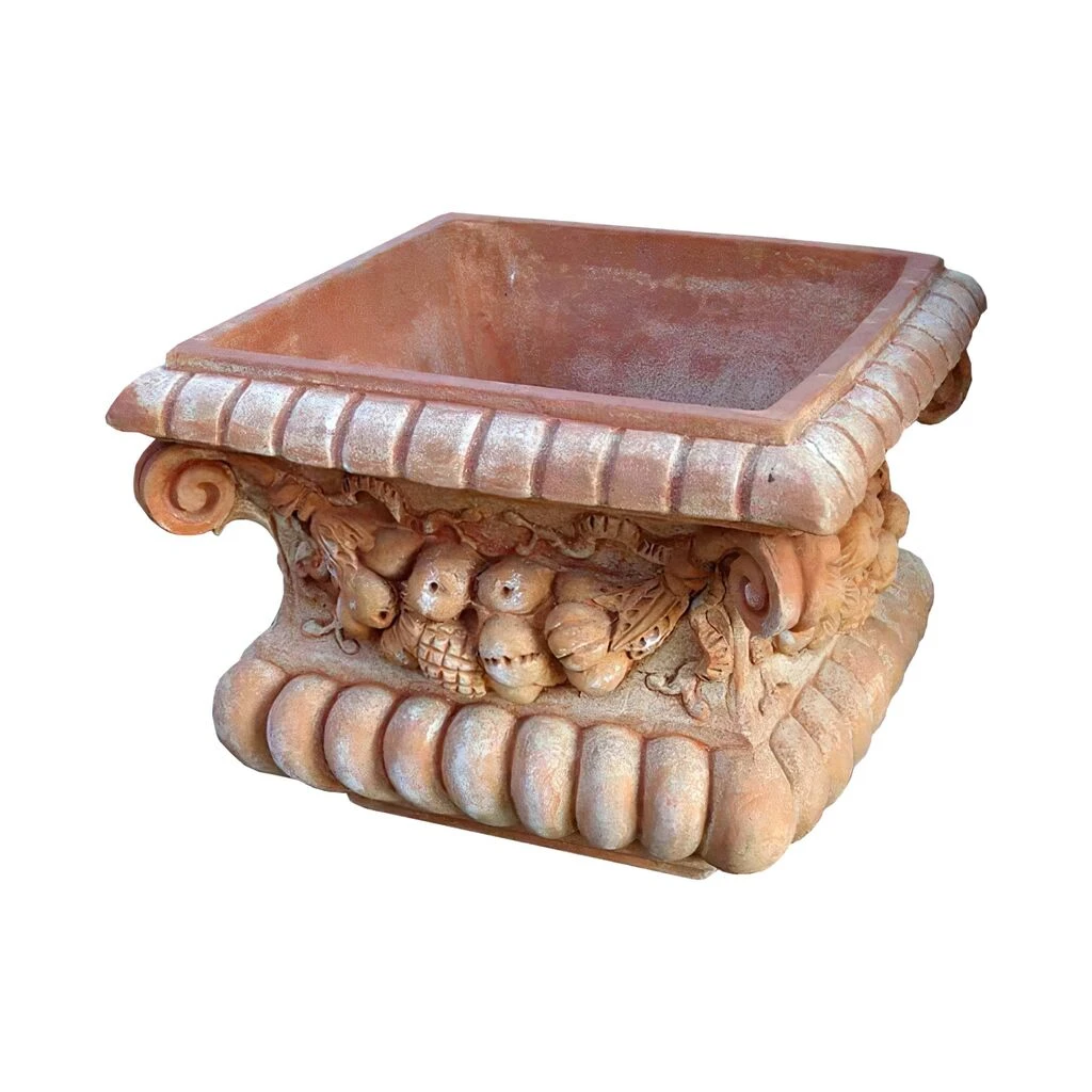 Bereits in der Antike und der Renaissance stellte Terrakotta ein beliebtes, leicht zu bearbeitendes Material dar, um Skulpturen, Vasen und Säulen stilvoll und gleichzeitig robust herzustellen. Für die Verarbeitung wird ein spezielles, eisenhaltiges Tongemisch verwendet, welches den Pflanztöpfen einen einzigartigen warmen, roten Farbton mit Nuancen verleiht. Für dieses Pflanzgefäß wird Impruneta-Terracotta verwendet, mit einem besonders hohen Anteil an Kuper-, Eisen- sowie Aluminiumoxiden. Nachdem das Steingut abgebaut und gekocht wurde, wird das Material zu einem Blumentopf geformt, welcher in liebevoller Handarbeit Verzierungen erhält. Nach der Modellierung erfolgt der Brennprozess im traditionellen Holzofen bei 960°C. Die für Terrakotta übliche Brenntemperatur liegt somit bei dieser speziellen Sorte höher. Im Gegensatz zu klassischem Ton erhält dieser Naturstoff keine Glasur am Ende der Bearbeitung. Passend zu dem Pflanzgefäß finden Sie bei uns Podeste und Skulpturen aus Terrakotta.